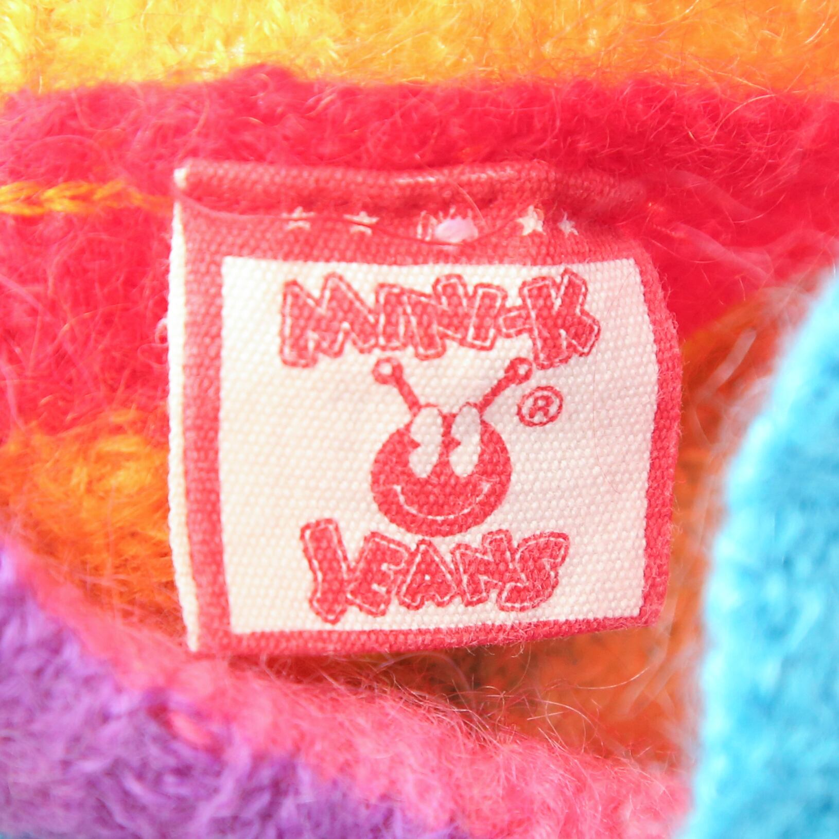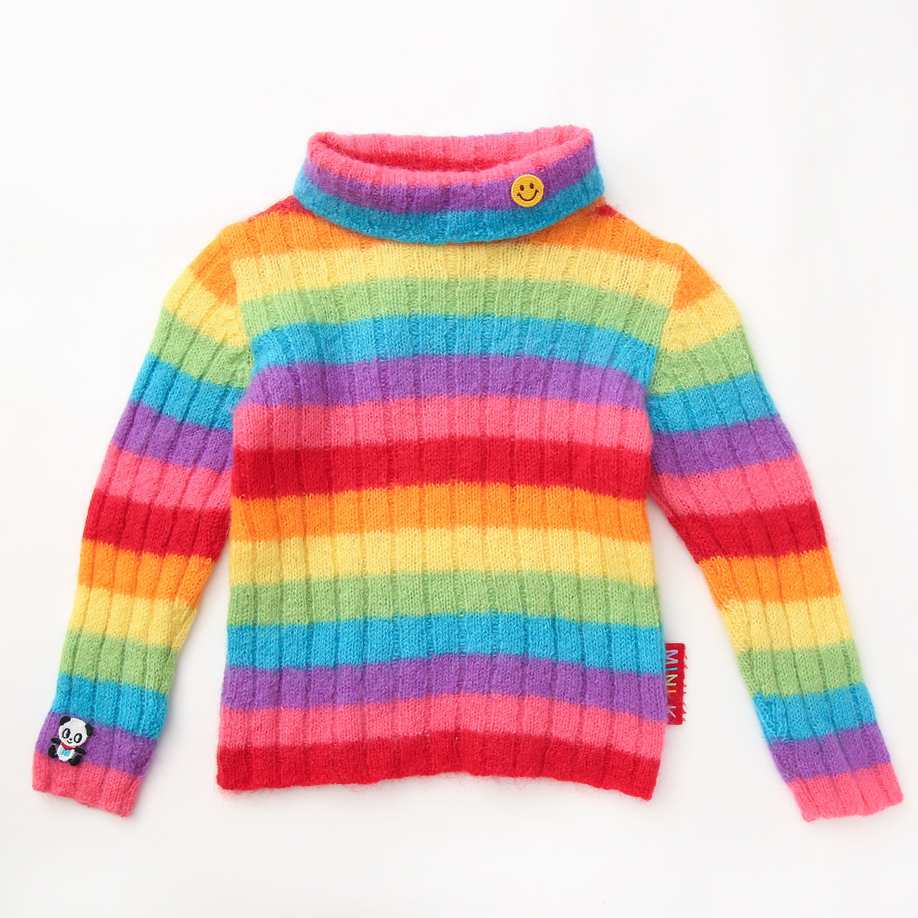 鮮やかなレインボーで、首元にニコちゃん、右袖部分にパンダのワッペンがついた可愛いニット!